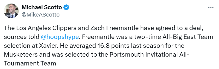 北京时间8月30日,据NBA名记Scotto报道,洛杉矶快船队已与来自泽维尔大学的内线扎克-弗里曼特尔就签约事宜达成一致。多位记者表示,弗里曼特尔预计签下的是一份Exhibit 10的训练营合同。