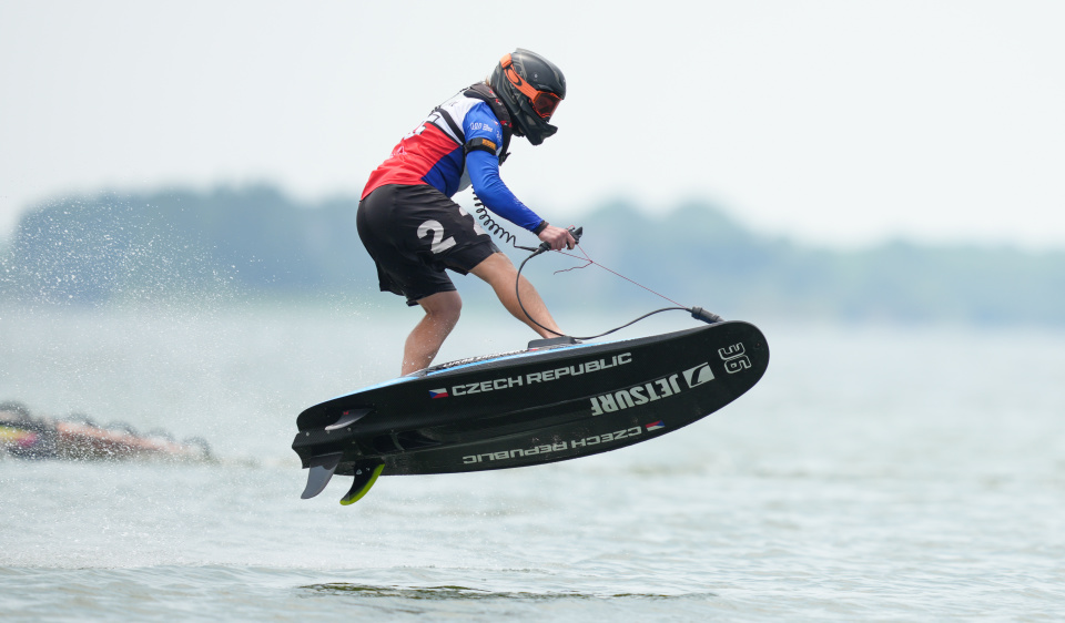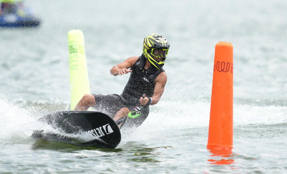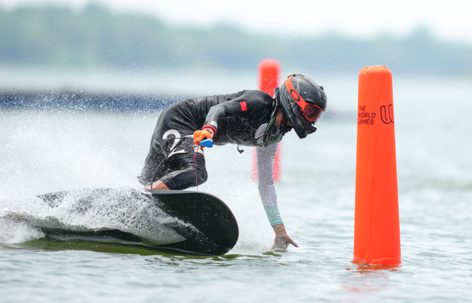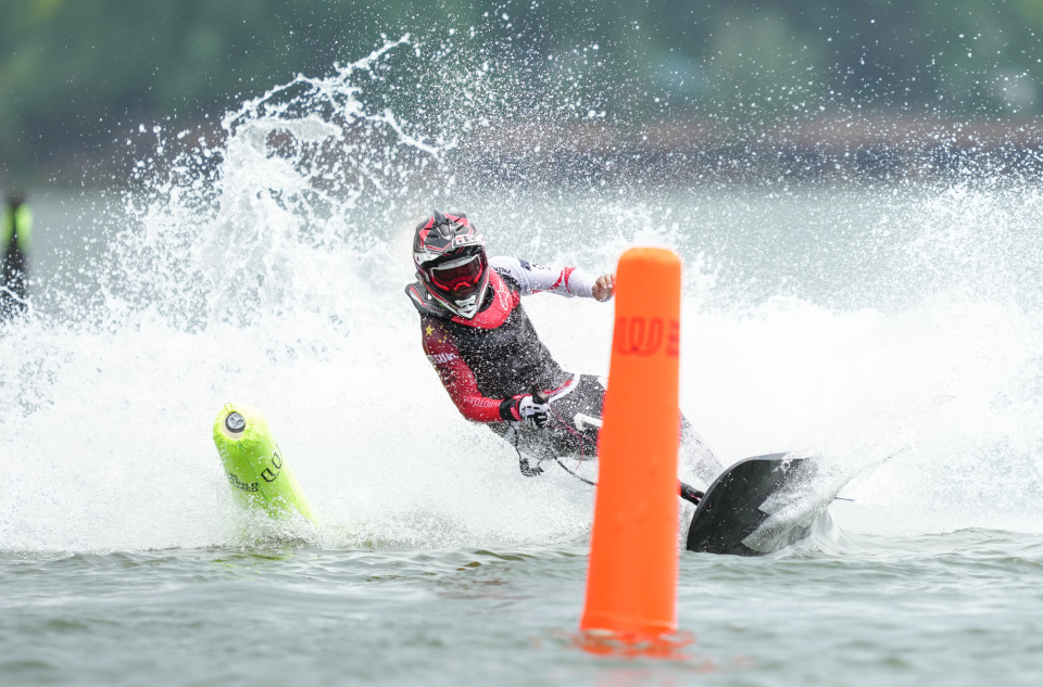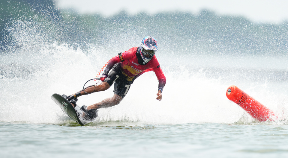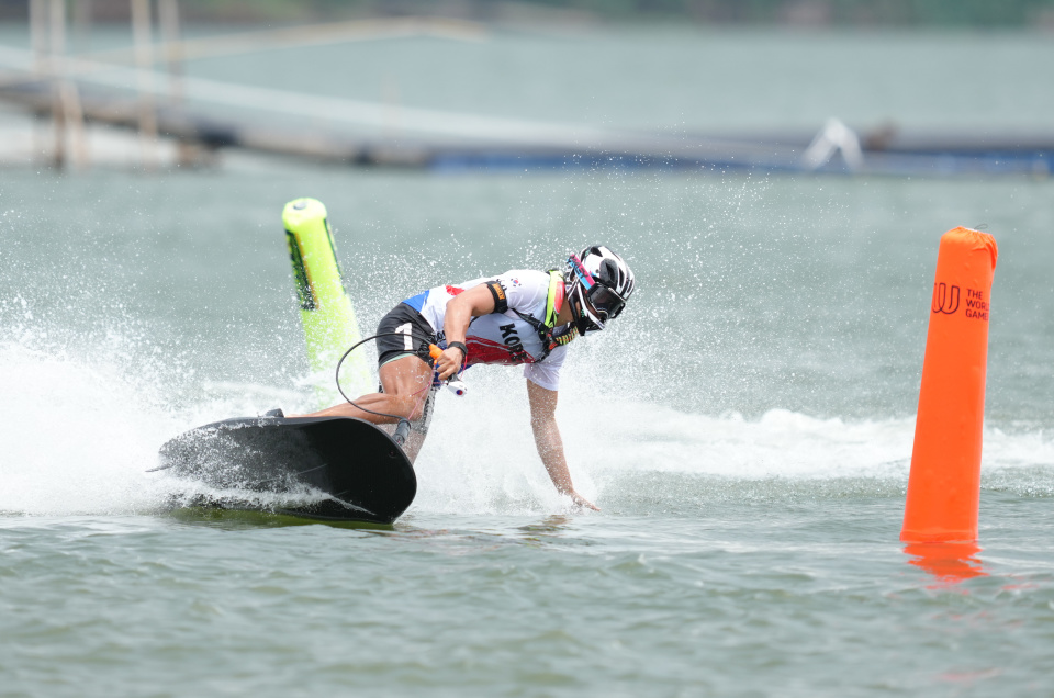当日,2025年成都世运会摩托艇男子动力冲浪板资格赛在成都三岔湖马鞍山赛场举行。8月15日,韩国选手金多温在比赛中。新华社记者 贝赫 摄